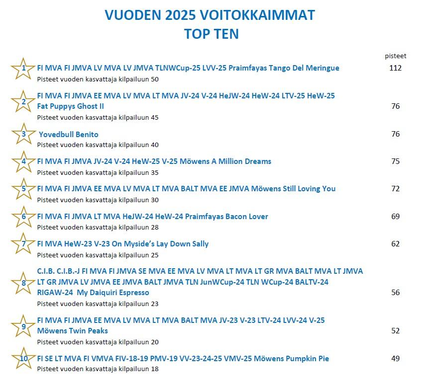 Vuoden Voitokkain 2025 Vuoden voitokkain kilpailuun osallistui yhteensä 44 englanninbulldoggia, joista 18 oli uroksia ja 26 narttuja. Koiria oli 10 suomalaiselta kasvattajalta ja viideltä ulkomaiselta…