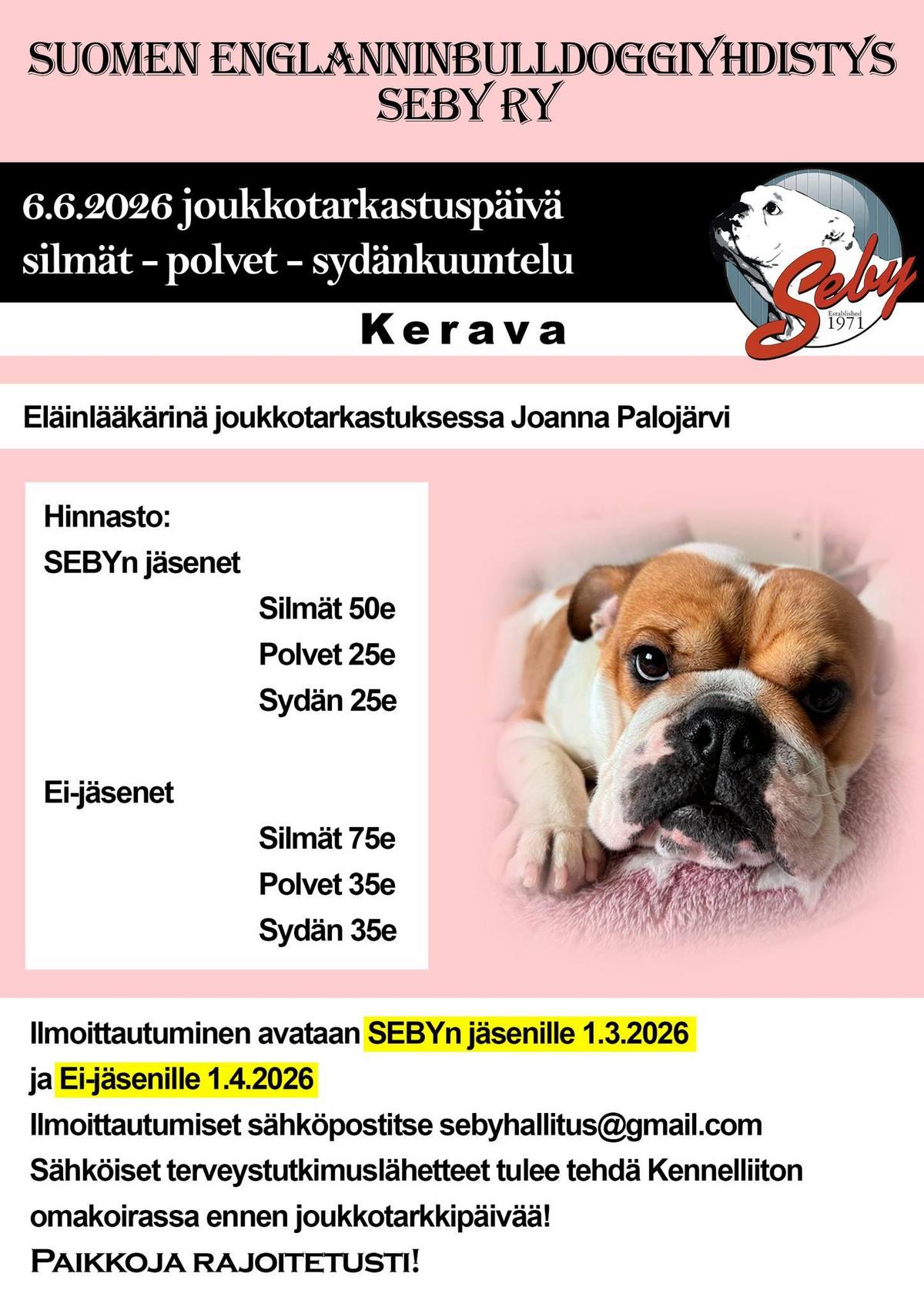 Suomen Englanninbulldoggiyhdistys SEBY ry:n sääntömääräinen vuosikokous järjestetään lauantaina 21.3.2026 klo 11:00. Kokoukseen osallistutaan paikan päällä ABC Majakka Pyhtää tai etäyhteydellä…