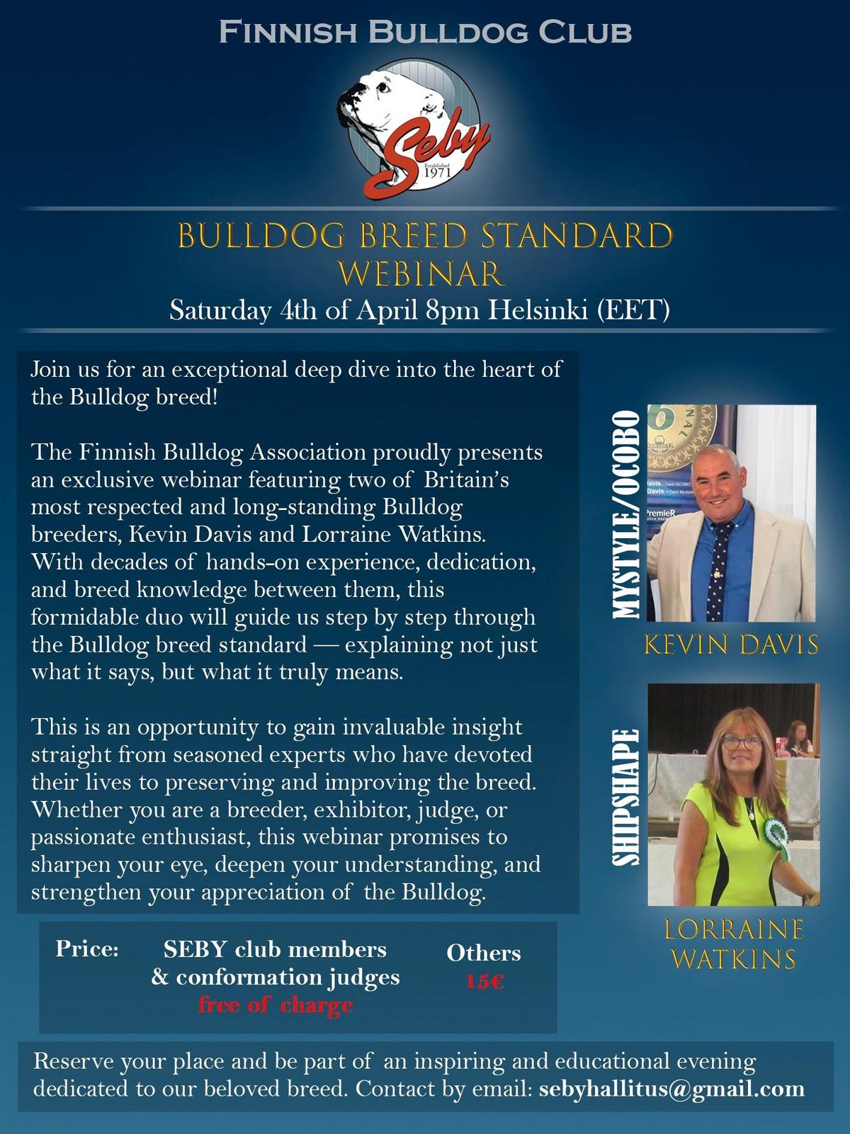 Suomen englanninbulldoggiyhdistys Seby ry on perustettu vuonna 1971. Olemme Suomen Kennelliiton jäsenyhdistys ja ainoa virallinen Suomen Kennelliiton alaisena toimiva englanninbulldoggien rotujärjestö. Vuonna 2015 yhdistyksestämme tuli rotujärjestö. Sivuiltamme löydät tietoa englanninbulldogista rotuna ja yhdistyksen toiminnasta.